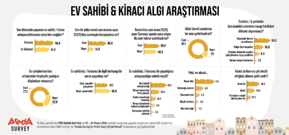 Buna göre, kiracıların yüzde 86’sı son bir yılda resmi zam oranını (yüzde 25) aşan kira zamlarıyla karşılaştığını ifade etti. Halkın yüzde 59,5’i resmi oran sınırının tekrar uzatılması gerektiğini düşünüyor. Kiracı/ev sahibi tartışmalarında halkın yüzde 59’u kiracıların mağdur olduğunu belirtirken yüzde 77,3’üne göre ev sahibi olmak artık hayal oldu. Katılımcıların yüzde 92,1’i ise aidatlara resmi bir sınır getirilmesi gerektiğini belirtti.
