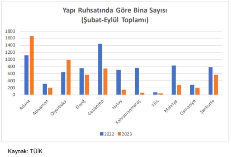 Deprem sonrasında bölgenin yeniden yaşanabilir hale gelmesi adına başlayan ıslah ve inşaat faaliyetlerinin 2023 yılına etkisi, beklenildiği üzere, sınırlı oldu. TÜİK’in açıkladığı verilere göre, ağır hasar gören illerdeki yapı ruhsatlarına göre bina sayıları bir önceki yılın altında kaldı. Depremin gerçekleştiği Şubat ayından en güncel veri olan Eylül sonuna kadar Hatay’da alınan toplam yapı ruhsat sayısı 146 adet oldu. Depremin merkez üssü olan Kahramanmaraş’ta ise yapı ruhsatına göre bina sayısı aynı dönemde 58 ile sınırlı kaldı. Depremden önceki yılın Şubat-Eylül döneminde ise yapı ruhsat sayısı Hatay’da 704, Kahramanmaraş’ta ise 766 idi.