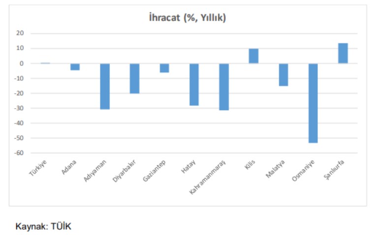 Merkez Bankasının Ocak ayında yayınladığı “Kahramanmaraş Depremleri Sonrası Bölgesel İhracattaki Toparlanma Eğilimi” adlı Ekonomi Notunda da (Can, 2024) benzer bir analiz yapılmaktadır. Çalışmada, 2023 Şubat ile Eylül aylarını kapsayan dönemde bölgedeki deprem kaynaklı ihracat kaybı yaklaşık 2,1 milyar dolar olarak hesaplanmıştır. En çok daralma da Adıyaman’da yüzde 43, Kahramanmaraş’ta yüzde 34, Osmaniye’de yüzde 32 ve Hatay’da yüzde 30 olarak hesaplanmıştır.