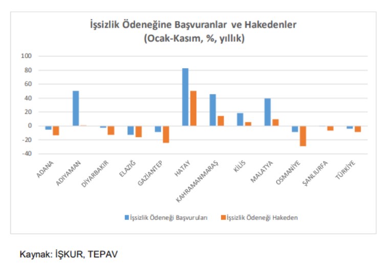 Deprem sonrasında yaşanan yıkımla beraber bölge dışına yüksek göç verilmesine rağmen deprem bölgesinde işsizlik rekor seviyede artmıştır. İşkur verilerine göre işsizlik ödeneğine başvuranlar, 2023 yılı Ocak-Kasım döneminde, depremden en çok etkilenen iller arasında yer alan Hatay’da yüzde 83, Adıyaman’da yüzde 50, Kahramanmaraş’ta yüzde 46, Malatya’da ise yüzde 40 oranında artmıştır. Aynı dönemde Türkiye genelinde bu oran yüzde 4 düşmüştür.