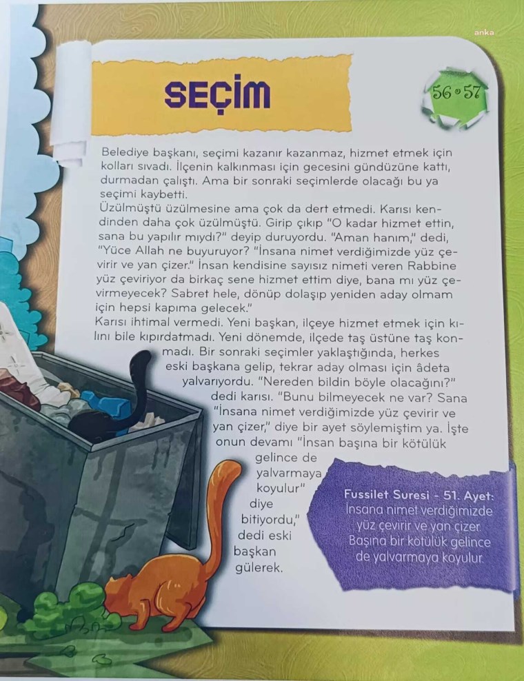“ÇEDES ile laik eğitime darbe vuran yeni müfredatla da eğitim sisteminin içinden geçen Milli Eğitim Bakanlığı, okullarda yine ÇEDES adı altında küçücük çocuklarımıza siyasi propaganda yaptı. İzmir Foça’da bir vaiz, Müftülük tarafından görevlendirildiği okulda, içeriğinde seçim başlıklı bir hikaye de bulunan ve 31 Mart seçimlerinde Türkiye genelindeki yerel seçim sonuçlarını hedef alan hikayelerle 40 Ayet adlı kitabı okutuyor.
